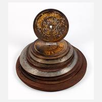 um 1930, gemarkt Säulophon, mit Händleretikett Rudolf Schüppl Stollberg/Erzgebirge, furniertes Mahagonigehäuse mit scharniertem Deckel und zweitüriger Front, verchromter Tonabnehmer und Drehscheibe, mit Start-Stopp-Hebel und originaler Kurbel, Werk läuft, aber rep.bed., beigegeben vier gefüllte Alben mit Schelllackplatten unterschiedlicher Marken, Alters- und Gebrauchsspuren, Maße 35 x 45 x 45 cm.