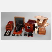 bestehend aus großer Plattenkamera, gemarkt L. G. Kleffel & Sohn Berlin, um 1900, aus feinstem Mahagoni mit Messingbeschlägen, Retouchierpult, Wechselkassetten in verschiedenen Größen, Objektiv, ungemarkt 2,9 F=8, Objektiv Steinhell München A3 18 x 24, großes Objektiv Carl Zeiss Jena Tessar 4,5/360, neuwertiger Faltenbalg 27 x 27 cm, Plattenkamera Orion Werk Hannover 1920 14 x 9 cm sowie diverse Zubehör- und Ersatzteile.
