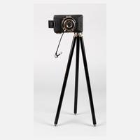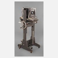 um 1970, gemarkt Globica, auf Etikett bezeichnet hergestellt in der Deutschen Demokratischen Republik, silberbronziertes Holzgestell, mittels Kurbel höhenverstellbare Kamera mit intaktem Faltenbalg, Objektiv gemarkt Meoptar 4,5/210, Alters- und Gebrauchsspuren, H 130 cm.