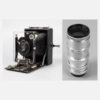 Anfang 20. Jh., ungemarkt, lederummanteltes Gehäuse, intakter schwarzer Faltenbalg, Objektiv gemarkt Laack Rathenow Anastigmat Pololyt 1:4,5 F=13,5, Plattenmaß 9 x 13 cm, mit Wechselplatten im Etui, dazu Objektiv Meyer Görlitz Weitwinkel Aristostikmat 1:6,3 F=10cm und Objektiv Meyer Görlitz Satzplasmat 1:4,5 F=17,3cm, zusätzlich bezeichnet Plasmatlinse 1:11 F=36cm, beide im originalen Etui, Alters- und Gebrauchsspuren, Funktion nicht geprüft.