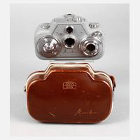 um 1958, gemarkt, graues Eisengehäuse, verchromte Metallteile, Objektiv gemarkt Tessar 1:1,9, F=10mm, im originalen Lederetui, Funktion nicht geprüft, sehr gute Erhaltung.