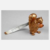 um 1900, Metallguss vergoldet, vollplastisch gearbeitetes Eichhörnchen mit eingesetzten Glasaugen, ursprünglich fellbesetzten Öhrchen und einer Eichel, Unterseite mit kleinem Kurbelmechanismus für textiles Maßband, Altersspuren, H 6 cm.