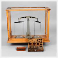 1950er Jahre, zweifach gemarkt Sartorius Werke AG Göttingen und nummeriert P16243, hell gebeiztes Nussbaumgehäuse, fünfseitig verglast, mit schiebbarer Front, feine Balkenwaage mit beigegebenem Gewichtssatz, dieser nicht komplett, Alters- und Gebrauchsspuren, Maße 45 x 53 x 24 cm.