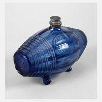 süddeutsch oder alpenländisch, 17./18. Jh., kobaltblaues Glas optisch geblasen, mit unregelmäßigem Abriss, auf vier eingerollten Füßen stehend, seitlich umlaufend aufgelegte gekniffene Bänder, Zinnmontierung mit Schraubdeckel, Glas von der Herstellung etwas blasig, Fadenauflagen nicht ganz komplett, L 20 cm.