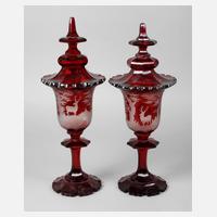 wohl Haida, Mitte 19. Jh., farbloses Glas, rubinrot gebeizt und fein geschliffen, die Kuppen umlaufend mit Tieren im Wald, hohe geschliffene Deckel, leichte Altersspuren, H je 50 cm.