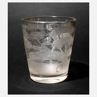 18. Jh., farbloses, etwas blasiges Glas, geschliffener Abriss, konische Form, Mattschliffdekor zwei Hirsche und ein Hund in Waldlandschaft, innen von der Herstellung eine geplatzte Blase, Gebrauchsspuren, H 9,5 cm.
