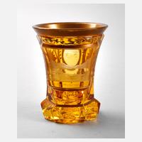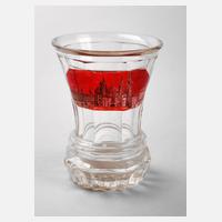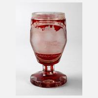 19. Jh., farbloses Glas, plangeschliffener Stand, rot gebeizt und matt geschliffen, vier Kartuschen: Andenken, Gesundheit, Glück und Vergnügen, am Lippenrand eine winzige Kerbe, sonst guter Zustand, H 12 cm.
