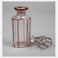 1. Hälfte 19. Jh., farbloses Glas, plangeschliffener Stand, ovale Grundform facettgeschliffen, die Konturen rubinrot bemalt, der Stopfen als Schnapsglas gestaltet, innen gepinselte Nummer 8, guter altersgemäßer Zustand, H 19 cm.