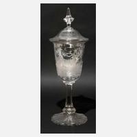 zum Prämienschießen, Crossen den 11. August 1883, farbloses Glas, Walzenschlifffuß, facettierter Balusterschaft, matt geschnittene Kuppa, kapitaler Hirsch und Hunde im Wald, Deckel mit Inschrift und angesetztem facettierten Knauf, guter Zustand, H 53 cm.