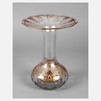 wohl Fritz Heckert Petersdorf, um 1880 bis 1890, honigfarbenes Glas, dreiteilig montiert, aufgelegte Bänder und angesetzte Nuppen aus violetten Glas, reiche Reliefgoldmalerei, partiell mit weißen Emaille gehöht, floraler und ornamentaler Dekor, am Mündungsrand halbplastische Blüten, an Stand und Mündung winzige Kerben und die Vergoldung partiell berieben, insgesamt guter altersgemäßer Zustand, H 45,5 cm.
