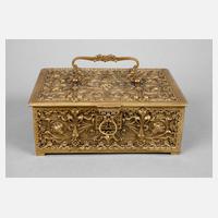 2. Hälfte 19. Jh., Montierung aus Messing, verziert mit Ornamentbändern, gewölbte Emailplatten mit Landschaftsdekor und Figuren, auf dem Deckel Anglerin mit Flöte spielendem Burschen, innen mit Samt und Spitze ausgekleidet (erneuert), am Schlüsselloch ausgebessert sowie eine kleine Restauration seitlich, Originalschlüssel vorhanden, L 19,5 cm.