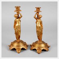 Frankreich, um 1820, Bronze vergoldet, mehrteilig gegossen und verschraubt, als Mädchen in langen Gewändern jeweils eine Kerzentülle tragend, ornamental reliefierter Fuß, geringe Gebrauchsspuren, H 34 cm.