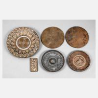 um 1900, Zinnplatte mit Omphalos Booten mit Odysseus bei den Sirenen, gestempelt BKB Berlin, Modellnummer 368, dazu eine Schale mit Pferdekopf der gleichen Marke, zwei Diskusplatten mit Darstellung römischer Olympioniken, beide mit Sammlungsnummern, eine Reliefplatte mit musizierendem Engel und ein christlicher Monogrammteller, alles mit Altersspuren, D max. 27 cm.