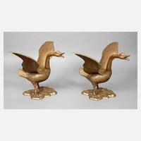 um 1920, Messing gegossen und patiniert, als Lampenfüße mit Bohrungen vorbereitet, mit weiten Flügeln, auf einem naturalistischem Sockel mit Seerosen stehend, normale Altersspuren, H 41 cm, B 62 cm.