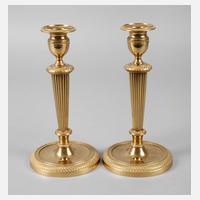 um 1840, Bronze vergoldet, mehrteilig verschraubte Leuchterteile mit geometrischen Ornamentbändern und Palmettenmotiven, qualitätsvolle Leuchter mit abnehmbaren Tüllen, normale Gebrauchs- und Altersspuren, H 21,5 cm.