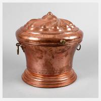 Nürnberg, 2. Hälfte 18. Jh., Kupfer getrieben, getreppter Standring mit nach unten umgeschlagenem verstärkten Rand, darüber ein Band in Nietenoptik, scharnierter Klappdeckel mit gedreht gerippter Rosette, gegossene florale Messingbeschläge, Ringösen als Handhaben, innen stärkere Altersspuren, minimal gedellt, H 40 cm, D 42 cm.