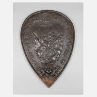 um 1900, reliefierte Herstellermarke, Schriftzug ”gesetzlich geschützt” sowie Modellnummer 3944, Eisenguss geschwärzt, mittig Darstellung einer kriegerischen Szene mit Rittern und Pferden, umgeben von verschiedener Symbolik und Floralmotiven, an der Spitze etwas korrodiert, rückseitig Wandaufhängung, H 65 x B 45 cm.