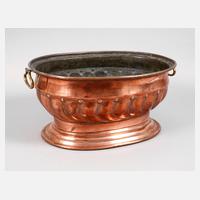 18./19. Jh., Kupfer getrieben, Messing gegossen, Ovalform auf getrepptem Fuß, Stand und Mündung verstärkt nach unten umgebördelt, schräg gerippte Wandung, klappbare Handhaben, innen Gebrauchsspuren, sonst schöner Originalzustand, L 52 cm.