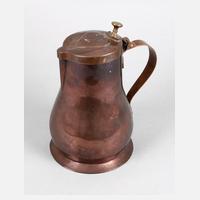 1. Hälfte 19. Jh., Kupfer getrieben und genietet, gegossener Messingknauf, bauchiger Krug mit ausgestelltem Stand und breitem Bandhenkel, auf dem Deckel ein reliefiertes Herz, innen verzinnt, etwas gedellt, sonst guter altersgemäßer Zustand, H 26 cm.