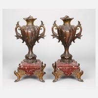 um 1890, Metallguss patiniert und vergoldet, mehrteilig montiert, Füße und Handhaben aus Rocaillen, die Sockel aus rotem geäderten Marmor, korrodiert, Einsätze fehlen, H 38 cm.