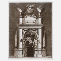 ”Portall aufwendig, für dem Duhm [meint: Dom], bei der Königin von Preußen begräbnus Ao. 1705”, im Zuge barocker Trauerinszenierung von gekrönten Häuptern war es üblich, aufwendige, temporäre Funeralarchitekturen (Castrum Doloris [dt. Trauerburg]) zu errichten, vorliegend die vom preußischen Hofbaumeister Johann Friedrich Nilsson Eosander Freiherr von Göthe, genannt Eosander de Göthe (1669–1728) und Baumeister von Schloss Charlottenburg im Jahre 1705 errichtete Trauerpforte am Berliner Dom, anlässlich des Todes der Königin Sophie Charlotte von Preußen (1668–1705), Kupferstich auf Bütten, 1718, rechts unten in der Darstellung bezeichnet ”Eosander de Göthe invent.” und rechts unter der Darstellung signiert ”P. Fehr fecit”, geringe Annotationen zum Blatt in Blei, ungerahmt, Plattenmaße ca. 39,5 x 30,5 cm, Blattmaß ca. 42 x 34,5 cm. Künstlerinfo: auch Pieter Fehr, dt. Kupferstecher (1681 Frankfurt am Main bis 1740 Frankfurt am Main), tätig für Verleger in Frankfurt am Main, Quelle: Thieme-Becker, Nagler und Internet.