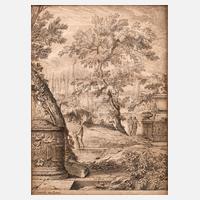 zwischen antiken Ruinen wandelt Figurenstaffage in einer parkähnlichen römischen Landschaft, Kupferstich, 18. Jh., unter der Darstellung links bezeichnet ”A. Genoels. inv. Romae”, Stecher unbekannt, Erhaltungsmängel, außerhalb der Platte beschnitten, hinter Glas gerahmt, Darstellungsmaß ca. 19 x 14 cm.