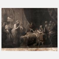 Szene aus der 1708 uraufgeführten Barockoper ”L’Amore Ammalato” von Christoph Graupner nach einem Libretto von Barthold Feind, die Geschichte erzählt von den Wirren der Liebe und insbesondere von der unerfüllten, krank machenden Liebe des Antiochus zu seiner Stiefmutter Stratonica, der zweiten Ehefrau seines Vaters, des assyrischen Königs Seleucus, in der vorliegenden Szene des 3. Aktes im Schlafzimmer des liebeskranken Antiochus bereitet dieser sich, umgeben von seiner Familie, in den Armen seines Vaters zum Sterben, lediglich der Leibarzt seines Vaters Erasistratos erkennt den wahren Grund der Leiden und führt mit Weisheit zum guten Ende, unter der Darstellung englisch betitelt ”Erasistratus the Physician, discovers the Love of Antiochus for Stratonice (dt.: ”Der Arzt Erasistratus entdeckt die Liebe des Antiochus zu Stratonica)”, Mezzotintoradierung nach einem Gemälde von Benjamin West (1738–1820), herausgegeben von John Boydell in London 1776, rechts unten in der Platte signiert ”Engraved by Val. Green ...”, stärkere Erhaltungsmängel, hinter Glas gerahmt, Plattenmaß ca. 50,5 x 65,5 cm. Künstlerinfo: engl. Graphiker in Mezzotinto und Kupferstich, Zeichner und Herausgeber (1739 Salford bei Evesham bis 1813 London), zunächst Rechtspraktikant in Evesham, 1760–65 Lehre in Kupferstich und Schabkunst bei Robert Hancock in Worcester, ab 1965 in London als Schabkünstler tätig, beschickte ab 1766 die Ausstellungen der Londoner Society of Artists, deren Mitglied er 1767 wurde, 1773 zum Hofschabkünstler von König Georg III. berufen, ab 1774 Mitglied der Königlichen Akademie, 1775 Reise durch die Niederlande und die Rheinlande, Ernennung zum Hofschabkünstler von Kurfürst Karl Theodor von der Pfalz, 1781 Studienaufenthalt in Paris, tätig in London, Quelle: Thieme-Becker, Singer, Bénézit und Internet.