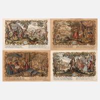 allegorische Darstellungen der vier Elemente, 1. Das Feuer/Ignis: mittels eines großen Herdfeuers, rauchenden Herren und einer Feuersbrunst dargestellt, 2. Das Wasser/Aqua: durch das Badevergnügen, Kahnpartien, das Angeln, eine Waschfrau, die von ihrem Liebhaber geneckt wird und Wasserspritzen, 3. Die Luft/Aer: mittels Flötenspiel, Zelten, in denen sich der Wind fängt und einer durch die Luft springenden, fast fliegenden Figur, 4. Die Erde/Terra: versinnbildlicht durch den Landbau und seine Früchte, jeweils mit einem gereimten Vierzeiler in Deutsch und Latein, vier kolorierte Kupferstiche, undatiert Mitte 18. Jh., in der Platte unten rechts jeweils signiert ”Ioh. Georg Hertel exc. A. V” sowie nummeriert 1 bis 4, Feuer und Wasser oben über dem Plattenrand eingerissen, sonst altersentsprechende Spuren, Luft und Erde in schönem Zustand, alt hinter Passepartout und Glas in vergoldeter Leiste gerahmt, Darstellungsmaße ca. 19 x 29 cm.