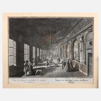 Blick in die Gallerie des barocken Lustschlosses Favorite bei Mainz, nach einer Zeichnung von Salomon Kleiner, Blick entlang der Längsachse der Galerie (Rheinschlösschen), in der sich ein buntes Treiben des höfischen Lebens zeigt, Pagen Torten, adlige Paare und Gruppen von Hofdamen befinden sich in Unterhaltung, teilweise führt man Hunde bei sich, unter der Darstellung sowohl in Französisch als auch in Deutsch bezeichnet ”Veue du dedans de la Gallerie la maison de plaisance/Prospect der innwendigen Galerie des Garten Gebaues”, Kupferstich aus Salomon Kleiners Werk ”Representation naturelle et exacte de la Favorite de Son Altesse Electorale de Mayence, en quatorze differentes Vues et autant de plans” (Augsbourg 1726), unten rechts signiert ”Iohann Georg Pinz Norimb. sculps. Aug. Vind.”, unten links ”Salomon Kleiner, Ingenieur Electoris Moguntice deliniavit”, rechts unten bis knapp in die Darstellung eingerissen, hinter Passepartout und Glas gerahmt, Darstellungsmaß ca. 24,5 x 34,5 cm.