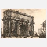 Blick auf den Triumphbogen des Septimius Severus am Forum Romanum, aus der Reihe ”Vedute di Roma”, bezeichnet ”Veduta dell' Arco di Settimio Severo”, links unter der Darstellung signiert ”Cavalier Piranesi del. e inc:”, Abzug um 1890 nach der Original-Radierung Piranesis um 1772, an der rechten unteren Ecke des Plattenrandes Blindstempel der ”Regia Cartographia di Roma”, unter der Darstellung Wasserzeichen ”P. M. Fabriano”, mäßig lichtrandig, hinter Glas gerahmt, Darstellungsmaß ca. 46,5 x 70,5 cm.