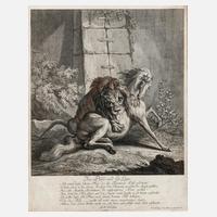 Blatt 1 von 8 aus der ca. 1760 erschienenen Folge ”Kämpfe reissender Thiere”, welche je mit prosaischen Gedichten des Hamburger Dichters und Schriftstellers Barthold Heinrich Brockes (1680–1747) versehen sind, Radierung auf Bütten, rechts unten in der Platte signiert ”J. El. Ridinger del., sculps. et excud. A.V.”, geringe Altersspuren, hinter Glas und Passepartout gerahmt, Plattenmaß ca. 38 x 29,5 cm. Künstlerinfo: dt. Maler, Graphiker und Verleger (1698 Ulm bis 1767 Augsburg), Schüler seines Vaters Johann Ridinger, ab ca. 1711 Schüler des Malers Christoph Resch in Ulm, ab 1713–14 bei Johann Falch in Augsburg, durch Vermittlung von Gabriel Spitzel 3 Jahre im Diensten Graf Metternichs in Regensburg, ab ca. 1718 Schüler der Augsburger Stadtakademie bei Georg Philipp Rugendas dem Älteren, hier 1757 zum “Assesor des evangelischen Ehegerichts” und 1759 zum Direktor der Stadtakademie ernannt, wurde durch Tier- und Jagddarstellungen berühmt, die einen Hauptteil seines Schaffens ausmachten, Quelle: Thieme-Becker, Wikipedia und Internet.
