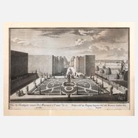 nach einer Zeichnung von Salomon Kleiner, Blick auf das Boulingrin am Rhein, welches von architektonisch zugeschnittenen Ziersträuchern eingerahmt wird, ein auf einer Leiter stehender Gärtner legt gerade Hand an, dahinter erheben sich hohe Boskette, auf den Wegen lustwandelt die Hofgesellschaft, in der Ferne erstreckt sich die leicht hügelige rechte Rheinseite mit ihren Festungswerken, unter der Darstellung sowohl in Französisch als auch in Deutsch bezeichnet ”Veue du Boulingrin entouré de Maroniers a l'entreé du jardin/Prospect deß am Eingang liegenden und mit Maronirn umsetzten Boulingrin”, Kupferstich aus Salomon Kleiners Werk ”Representation naturelle et exacte de la Favorite de Son Altesse Electorale de Mayence, en quatorze differentes Vues et autant de plans” (Augsbourg 1726), unten rechts signiert ”Iohann Matthias Steidlin sculpsit Augustae Vindelicorum”, unten links ”Sal. Kleiner Ing. Elect. Mogunt. del.”, leichte Erhaltungsmängel, hinter Passepartout und Glas gerahmt, Darstellungsmaß ca. 25 x 39 cm.