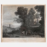 Gruppe von Bauern mit ihrem Vieh in bergiger, bukolischer Landschaft, vor mächtigen Laubbäumen, links der Blick in ein weites Tal mit Steinbogenbrücke, nach einem Gemälde von Claude Lorain, unter der Darstellung ausführlich betitelt, malerisch wirkender Kupferstich in der für den Künstler so typischen Manier, um 1780, unter der Darstellung in der Platte signiert rechts „Joan. Volpato direxit et vendit Roma“, links „Claudius Geleé vulgo Lorenese pnx.“ sowie mittig „Stephanus Tofanelli delin“, leichte Altersspuren, hinter altem Glas in ca. 7 cm breiter schlichter, edelholzfurnierter Holzleiste mit gesägten und versperrten Ecken gerahmt (leichte Erhaltungsmängel, Falzmaß ca. 55,5 x 63,5 cm), Darstellungsmaß ohne Schrift ca. 44,5 x 57,8 cm. Künstlerinfo: italienischer Radierer (1733 Bassano bis 1803 Rom), Lehre als Steinmetz, 1760–62 Schüler an der Calcografia Remondini in Bassano, folgte anschließend Bartolozzi nach Venedig, ab 1772 in Rom ansässig, betrieb hier auch eine Schule für Kupferstich, 1786 gründete er in Via Pudenziana eine Porzellanfabrik, Papst Pius verlieh ihm das Privileg der Nachbildung von Altertümern, Quelle: Thieme-Becker und Internet.