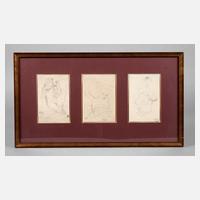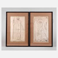 Rückansicht eines auf einen Stab gestützten Mannes und Darstellung eines Mannes mit erhobenen Armen an einem Fels emporklimmend, wohl Musterblätter aus einer Zeichenschule des 18. Jh. teils mit Markierung der Längenverhältnisse der Körperteile, 2 Radierungen auf Bütten, unsigniert, 1x verdruckt, geringe Altersspuren, je als Pendants hinter Glas und Passepartout gerahmt, Passepartoutausschnitt ca. 33 x 19,5 cm bzw. 33 x 19 cm.