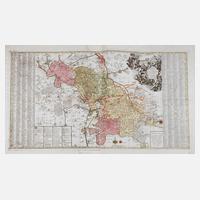 zeigt das Gebiet zwischen Eilenburg und Dresden bzw. Rochlitz und Großenhain, bezeichnet ”Circuli Misnici Praefectura Quatuor cum Nosseni Oschasensi Wurcena...”, prächtige Titelkartusche mit Allegorik auf die sächsischen Erzeugnisse, umfangreiche Legende, gebietskolorierter Kupferstich mit den Ämtern Wurzen, Nossen und Oschatz und denen von Meißen, datiert ”Aug. Vindel” (Augsburg) 1760, unter Kartusche signiert ”J. F. Leizel fec.” (Augsburger Kupferstecher Balthasar Friedrich Leizel), in der Kartusche Nennung des Kartographen ”accuratione plenissime descriptae a Alberto Carolo Seuttero” (Albert Karl Seutter), zwei Bugfalze, geringe Erhaltungsmängel, ungerahmt, Darstellungsmaß ca. 56 x 97 cm.