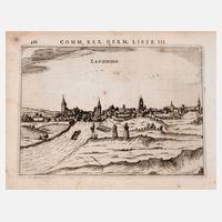 Ansicht der Stadt im Landkreis Dillingen an der Donau, im bayerischen Regierungsbezirk Schwaben, wohl aus einer posthumen Auflage des frühen 18. Jh. des Ansichtenwerks ”Commentariorum Rerum Germanicarum Libri Tres” von Petrus Bertius, Kupferstich auf Bütten, in der Darstellung betitelt ”Laugingen”, über der Platte typographisch bezeichnet ”586 – Comm. Rer. Germ. Liber III.”, unten neuzeitliche Annotationen in Blei ”1723 Bertius Lauingen”, rückseitig lateinischer Text zu Landshut, geringe Altersspuren und Montierungsreste, ungerahmt, Plattenmaß ca. 14 x 19 cm. Künstlerinfo: auch Peter Bert, niederländischer Theologe, Mathematiker, Historiker, Kartograph und Geograph (1565 Bevern/Flandern bis 1629 Paris), zunächst in Bevern aufgewachsen, ab 1568 mit seinen Eltern aus religiösen Gründen Exil in London, studierte Sprachen in London, ab 1577 Studium an der Universität Leiden und Heidelberg, 1593 als Bibliothekar und Professor für Mathematik in Leiden tätig, Schwager von Jodocus Hondius, 1612 Aufgabe der Professur wegen theologischer Dissonanzen und Flucht nach Frankreich, hier 1618 von König Ludwig XIII. von Frankreich zum Geographen und Historiographen ernannt, 1620 Übertritt zum Katholizismus und Professur am Collège de Boncour, Quelle: Internet.