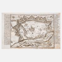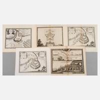 aus Chronik von Samuel von Pufendorf, Nürnberg, 1697, fünf Blatt, 1.) „Situs Oppidi Colo… 1655“, Belagerung von Kolo/Kolo, 2.) zweimal „Ichnographia Arcus munitissimae – Tinchinensis... 1655“, 3.) Arx Wischnizensis... 1655“, 4.) „... Chrzistopora... 1655“, Chrzistopora bei Sandomir, Kupferstiche, teilweise in der Platte signiert „Lapointe“, mittig übliche Faltlinie, unterschiedliche Erhaltungen, Darstellungsmaß max. ca. 29 x 37 cm.