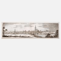 Blick von oberhalb des linken Ufers des Flüsschens Nonette über die Dächer der Stadt mit ihrer Kathedrale, mit dem alten lateinischen Namen ”Silvanectum” bezeichnet, Kupferstich aus Merians ”Neuwe Archontologica Cosmica” von 1638, unsigniert, ursprünglich befand sich unter dieser Vedute auf der gleichen Platte eine Ansicht von Limoges (abgetrennt), Heftfahne und Bugfalz, geringe Erhaltungsmängel, ungerahmt unter Passepartout, Darstellungsmaß ca. 9 x 31 cm.