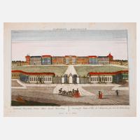 Vedute der russischen Zarenresidenz vor den Toren Petersburgs, unter der Darstellung bezeichnet in Deutsch ”Sarskoeselo, Kaiserlicher Sommer-Palast ohnweit Petersburg” und Französisch ”Sarskoeselo Palais d'Ète de l'Empereur pas loin de Petersbourg”, darüber spiegelverkehrt ”Russischer Prospect”, kolorierter Kupferstich, nach 1808, unsigniert, verlegt beim Augsburger Kunsthändler Joseph Carmine, geringe Erhaltungsmängel, ungerahmt, Darstellungsmaß ca. 27 x 39,5 cm.