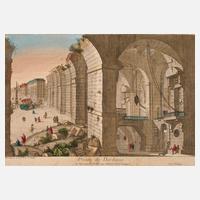 1739 schuf Jean-Philippe Rameau in Paris die barocke Oper ”Dardanus”, für die Requisite zeichnete Giovanni Battista Piranesi einen oppulenten, antiken Gefängnisraum, das populäre Blatt erfreute sich auf Grund seiner schaurigen Mystik großer Beliebtheit und wurde im vorliegenden Stich von Basset seitenverkehrt in die erweiterte Komposition der Szene als Ruine vor barocker Stadtkulisse aufgenommen, Blick in teils abgebrochene Gewölbe an einer prächtigen Straße mit Figurenstaffage, unter der Darstellung betitelt „Prison de Dardanus ou Vue nouvelle Dédiée aux amateurs de l´Optique“, kolorierter Kupferstich, um 1780 unterhalb der Darstellung bezeichnet „chez Basset A Paris Rue St. Jacques“, auf Unterlagekarton doubliert, leichte Altersspuren, Darstellungsmaß ohne Schrift ca. 23,5 x 37 cm.