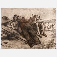 karge Wüstenlandschaft, mit ruhenden Männern in orientalischer Tracht, wohl Radierung, rechts oben im Druck Ligaturmonogramm im Kreis ”ED”, rechts unten im Druck signiert ”Delacroix”, links unter der Darstellung ”E. Delacroix sculp.” und rechts Druckerangabe ”Imp. Delâtre, Rue St. Jacques 303, Paris”, geringe Altersspuren, hinter Glas und Passepartout gerahmt, Passepartoutausschnitt ca. 14,5 x 20,5 cm.