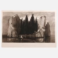 Fährmann Charon mit weiß verhüllter Gestalt vor einem Sarg im Nachen auf den Acheron steuern auf eine steil aus dem Meer aufragende und mit Trauerzypressen bewachsene Felseninsel zu, der Künstler Max Klinger setzte bei der hier vorliegenden Arbeit kongenial die III. Fassung der Toteninsel von Arnold Böcklin von einem Gemälde in eine Radierung um, der Galerist von Arnold Böcklin Fritz Gurlitt beauftragte Max Klinger die Radierung anzufertigen um die ohnehin große Bekanntheit der Toteninsel noch zu erhöhen, das von Böcklin entwickelte Bildthema fand selbst in der Literatur Niederschlag so zum Beispiel bei Heinrich Mann in „Die Göttinnen”, die 5 Versionen der Toteninsel wovon vier noch erhalten sind zählen zu den wichtigsten Gemälden des Symbolismus, Radierung, 1890, links unter der Darstellung in der Platte bezeichnet ”Arnold Böcklin pinx.” und rechts signiert ”Max Klinger sculp.”, unten mittig btitelt ”Die Toteninsel - Das Originalgemälde im Besitze des Herrn J. C. Schoen in Worms”, stockfleckig, hinter Glas und Passepartout im restaurierungsbedürftigen Architekturrahmen, Abbildung ca. 41 x 69,5 cm. Künstlerinfo: bedeutender dt. Graphiker, Maler und Bildhauer (1857 Leipzig bis 1920 Großjena bei Naumburg /Saale), Sonntagsschüler der Zeichenschule Bauer in Leipzig, studierte ab 1874 bei Karl Gussow und Ludwig Des Coudres an der Akademie Karlsruhe, 1875 Wechsel mit Gussow an die Akademie Berlin, erhält 1876 Akademiezeugnis mit Prädikat „Außerordentlich” und Silberne Medaille, 1879 in Brüssel tätig, hier Schüler von Emile Charles Wauters, 1880 in München ansässig, ab 1881 Atelier in Berlin, Freundschaft zu Karl Stauffer-Bern und Bekanntschaft zu Alfred Lichtwark, Studien- und Arbeitsaufenthalte in Paris und Rom, 1892 Gründungsmitglied der ”Gruppe der XI”, ab 1893 Atelier in Leipzig, 1897 zum Professor der Leipziger Akademie ernannt, Korrespondierendes Mitglied der Wiener Secession, 1901 Gründungsmitglied und ab 1906 Vorsitzender des Villa-Romana-Vereins, 1903 Erwerb des Weinberghäuschens in Großjena bei Naumburg, Quelle: Thieme-Becker, Wikipedia und Internet.