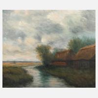 nebelverhangene Worpsweder Landschaft mit Katen am Moorkanal, hierzu bemerkt Wikipedia: ”1933 kommt Szerbakow mit seiner Ehefrau Frieda nach Worpswede, ... Die Gegend um das Teufelsmoor spricht ihn an, hier fühlt er sich hingezogen. Die Moore und Flusslandschaften, die Stille und Einsamkeit der Gegend haben es dem Künstler angetan. ... Seine Landschaftsgemälde zeigen häufig nebelverhangene Moormotive und Sonnenuntergänge.”, lasierende Landschaftsmalerei, Öl auf Hartfaser, um 1980, rechts unten signiert ”Th. Szerbakow”, gerahmt, Falzmaße ca. 50,5 x 60 cm. Künstlerinfo: eigentlich Theodor Szerbakowski, nennt sich als Künstler meist Feodor Szerbakow, dt. Maler (1911 Eckertsdorf [Wojnowo] in Ostpreußen bis 2009 Seebergen), Kindheit in Eckertsdorf/Ermland-Masuren und Mithilfe auf dem elterlichen Bauernhof, 1928 Umzug nach Stettin und erster Malunterricht, ab 1930 Studium an der Kunsthochschule Berlin bei Hentschke, Lange und Buchholz, 1933 erster Besuch von Otto Modersohn in Fischerhude, dessen Schüler er wird, Kriegsdienst im 2. Weltkrieg, nachfolgend intensive Beschäftigung mit der Zucht exotischer Pflanzen und Rhododendron-Büsche, in den 1970er Jahren wieder Hinwendung zur Malerei, tätig in Seebergen, Quelle: Wikipedia und Internet.