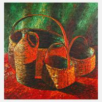 stimmungsvolle Komposition aus drei Weidenkörben und einer Flasche in Weidenummantelung, im effektvollen warmen Feuerschein, vor grünem Grund, typische, impressionistische Arbeit des Künstlers, in dessen malerischem Werk die Behandlung luministischer Fragestellung einen breiten Raum einnimmt, pastose Malerei mit charaktervollem Pinsel- bzw. Spachtelduktus in kraftvoller Farbigkeit, Öl auf Leinwand, um 1995, rückseitig auf der Leinwand kyrillisch signiert ”I. J. Tarnov” und russisch betitelt ”Stillleben” sowie undeutlicher Stempel, gerahmt, Falzmaße ca. 80,5 x 80,5 cm. Künstlerinfo: auch Tarnow, russischer Industriedesigner und Maler (geboren 1965 in Bogoroditsk/Region Tula), zunächst Schüler der Kinderkunstschule, studierte ab 1982 industrielle Formgestaltung und Gebrauchsgraphik in Twer, anschließend Rückkehr nach Bogoroditsk, hier Gründer der Künstler- und Designervereinigung ”Interior”, widmete sich parallel zu seiner Designerarbeit der Malerei, tätig in Tula, Quelle: Internet.