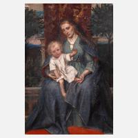 Darstellung Mariens im Typus Dexiokratusa mit dem Jesuskind auf dem rechten Arm, die Szene vor einer Tapisserie in mediterraner Landschaft, verso handschriftlich auf dem Rahmen bezeichnet: original Skizze von Prof. Feldmann im Auftrag von dem Maler Graf Brühl (für Erwein Grafen Elz und seine Frau Hanna... Schönborn Wiesentheid, lasierende Genmalerei, Öl auf Leinwand, Craquelure, unsigniert, ungerahmt, 31 x 22 cm.