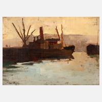 Blick auf eine ruhige Flusslandschaft mit Fischkutter, leicht pastos, mit breitem Pinselduktus, links unten und rechts oben signiert, datiert 1909, Öl auf Malkarton, in schmaler Leiste der Zeit, Falzmaß 23 x 31 cm. Künstlerinfo: russischer Genre- und Bildnismaler (1877 St. Petersburg bis 1948 Frankreich), studierte an der Akademie in St. Petersburg, dann bei Jean-Paul Laurens und Gustave Courtois in Paris, regelmäßig 1910-1941 im Salon des Artistes Francais vertreten, Werke in diversen französischen Museen und in Moskau. Quelle: Internet.