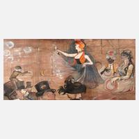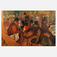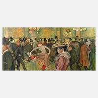 Kopie nach Henry de Toulouse-Lautrec, stimmungsvoll erfasste Ballszene mit vornehm gekleideter Gesellschaft und tanzendem Paar, lasierende Kopie als Ausschnitt aus dem 1890 entstandenen Gemälde ”Ball im Moulin Rouge”, Öl auf Leinwand, auf Holzrahmen aufgezogen, um 1980, unsigniert, verzogen, Fehlstelle in der Leinwand, restaurierungsbedürftig, ungerahmt, Maße ca. 60 x 120 cm. Künstlerinfo: eigentlich Henri Marie Raymond de Toulouse-Lautrec-Monfa, frz. Maler, Graphiker und Plakatkünstler (1864 Albi bis 1901 auf Schloss Malromé Gironde), ab 1882 Schüler des Pariser Modemalers Léon Bonnat, später bei dem Salonmaler Fernand Cormon, 1884 eigene Wohnung und Atelier am Montmartre in Paris, die umliegenden Vergnügungsetablissements und Lokale werden sein zweites Zuhause, fertigte Lithographien als Plakate oder als Illustrationen für Zeitungen und Zeitschriften, meist mit Künstlern und Persönlichkeiten der französischen Belle Époque, die er zum größten Teil persönlich kannte, z.B. 1885 Aristide Bruant, 1888 Hinwendung zum Zirkus-, Cabarett und Halbweltmilieu, Quelle: Thieme-Becker und Wikipedia.
