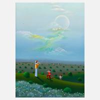 drei flötende Kinder, aus deren Flöten die Töne wie Luftblasen zum Himmel schweben und ein Traumschloss vor Mondkulisse besuchen, fein mit spitzem Pinsel minutios dargestellte naive Malerei, alles in hellen freundlichen Farben subtil einen romantischen Eindruck erzeugend, Öl auf Leinwand, rechts unten und verso signiert, in einer schmalen vergoldeten Leiste gerahmt, diese minimal berieben, Gesamtmaß 41,5 x 31,5 cm. Künstlerinfo: Henry Vitor, brasilianischer Autodidakt, Vertreter der brasilianischen naiven Kunst, geboren 1939 in Guaxupe, studierte Journalismus, Werbung und Öffentlichkeitsarbeit, parallel dazu entwickelte er seine Technik in subtiler und zarter Pinselführung, welche Einfachheit, Freude, Träume und Frieden vermitteln sollen, heute kann er auf zahlreiche Ausstellungen im In- und Ausland zurückblicken (u.a. USA, Frankreich, Spanien und Japan), Quelle: Internet.