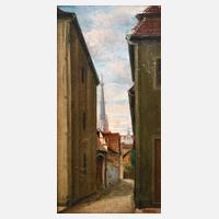 sommerlicher Blick, durch altstädtische Gasse, auf die Marienkirche im thüringischen Mühlhausen, minimal pastose Vedutenmalerei, Öl auf Leinwand, partiell blasig auf Karton aufgezogen, 1. Hälfte 20. Jh., rechts unten signiert ”Volkmar”, etwas restaurierungsbedürftig, original gerahmt, Falzmaße ca. 60 x 33 cm.