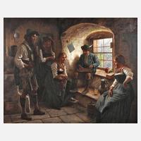 andächtig einen Zither spielendem Knaben lauschende Gesellschaft, in alpenländischer Tracht, im Kücheninterieur, Genrebilder mit Sujets in der Tradition eines Franz von Defregger und Wilhelm Leibls erfreuten sich um 1900 breitester Beliebtheit und machten einen Großteil des Schaffens des Münchner Malers Maximilian Wachsmuth aus, fein erfasste, akademische, lasierende, partiell pastose Genremalerei in zurückhaltender Farbigkeit, Öl auf Leinwand, um 1900, rechts unten ligiert signiert ”M. Wachsmuth”, etwas restauriert, original gerahmt, Falzmaße ca. 80 x 100 cm. Künstlerinfo: dt. Maler (1859 Laßrönne/Hannover bis nach 1930 München), zunächst in Bremen ansässig, 1883-85 Studium an der Akademie in München bei Heinz Heim, Johann Caspar Herterich, Nikolaus Gysis und Otto Seitz, nachfolgend wechselnde Aufenthalte in München und Bremen, letztendlich in München ansässig, 1910 längerer Aufenthalt in Ischgl im Paznauntal in Tirol, beschickte 1904, 1906, 1908 und 1911 die Ausstellungen im Münchner Glaspalast, Mitglied der Münchner Künstlergenossenschaft und im Reichsverband Bildender Künstler Deutschlands, Quelle: Müller-Singer, Thieme-Becker, Matrikel der Münchner Akademie, Dressler 1907-1930, Bruckmann ”Münchner Maler des 19./20. Jh.”, Saur Bio-Bibliographisches Künstlerlexikon, Müller-Singer und Wikipedia.